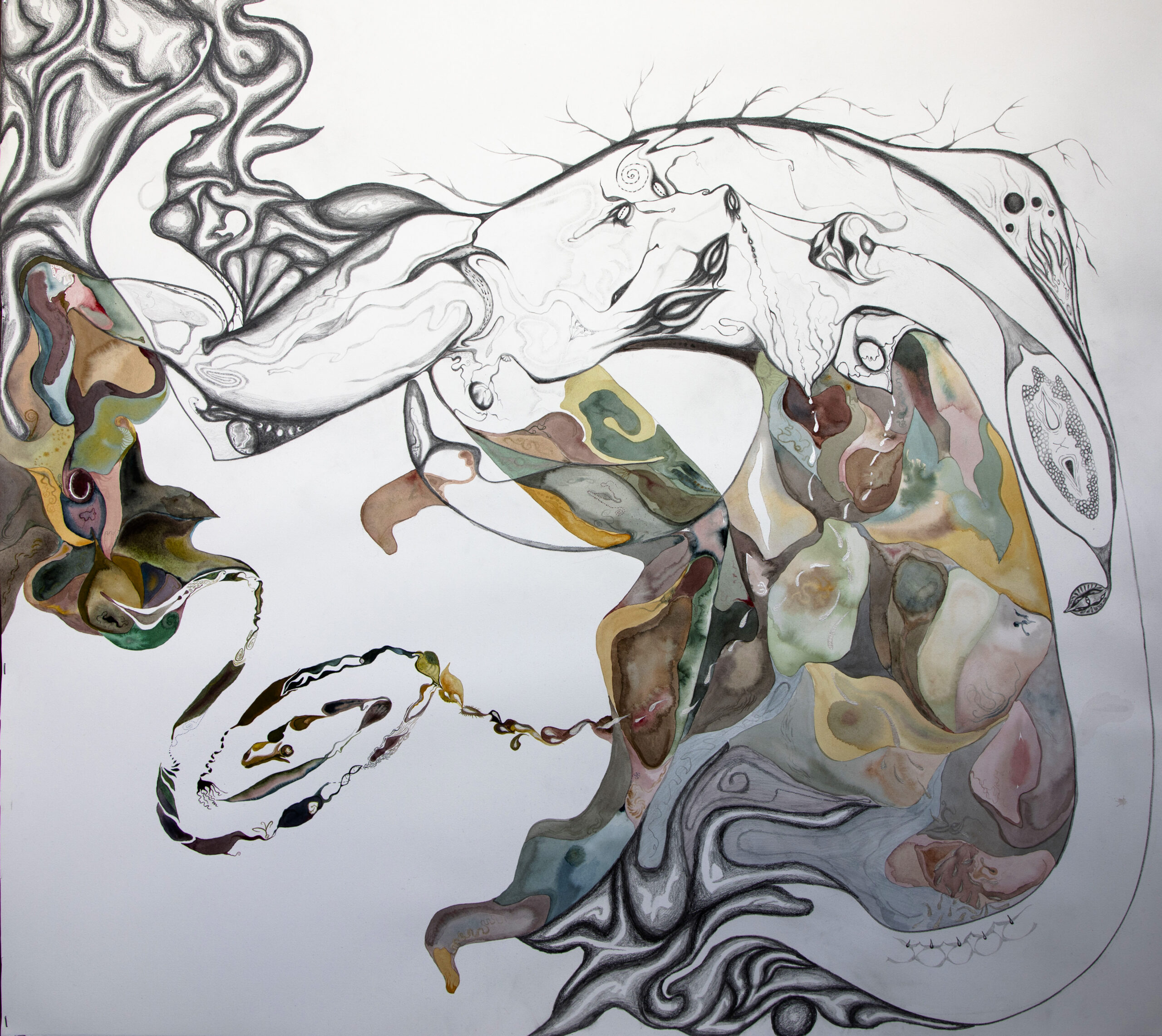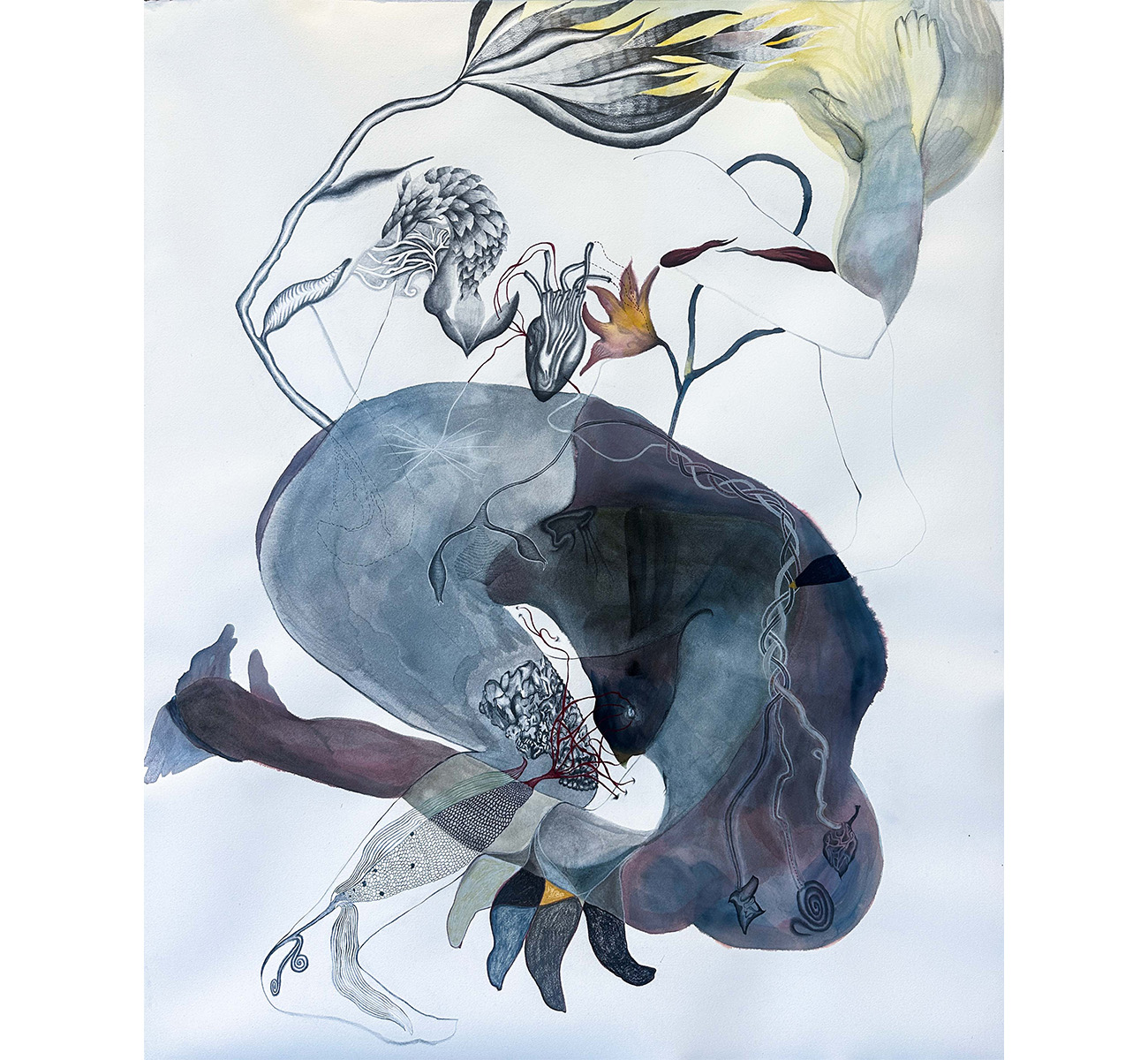 The living vessels I create begin as anatomical maps in which I am thinking about the seen and unseen aspects of the human body. These vessels are seen in convergence with land, the cosmos, and my observations of motherhood. I am constantly zooming in and out of a micro or macrocosmic lense, in turn creating a rhythmic dance between the physical and existential. I frequently depict the body's acts of resistance and creation (menstruation and lactation), I see these bodily acts as being interwoven with the world's ongoing resistance movements; shedding the harmful and unnecessary and giving life to the nurturing roots of humankind.