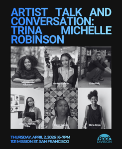 Join us for an intimate conversation with artist Trina Michelle Robinson along with collaborators Ashley Spencer, Chloe King, Jasmine Narkita Wiley and Lynse Cooper, moderated by writer and curator Elena Gross. At Root Division, Robinson presents an expanded version of Elegy for Nancy (2022) — a tender tribute to her oldest known ancestor. This immersive installation includes special contributions from fellow Bay Area artists, highlighting how collective knowledge, imagination, and care can reframe historical erasure. Open Your Eyes to Water is a two-site solo exhibition that spans 500 Capp Street and Root Division.